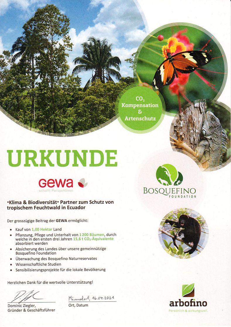 Wir wollen, dass unsere Erde auch in Zukunft ein lebenswerter Ort für alle ihre Bewohner/innen bleibt. Darum unterstützt die GEWA das Projekt Arbofino zur Wiederaufforstung des tropischen Feuchtwaldes in Ecuador.